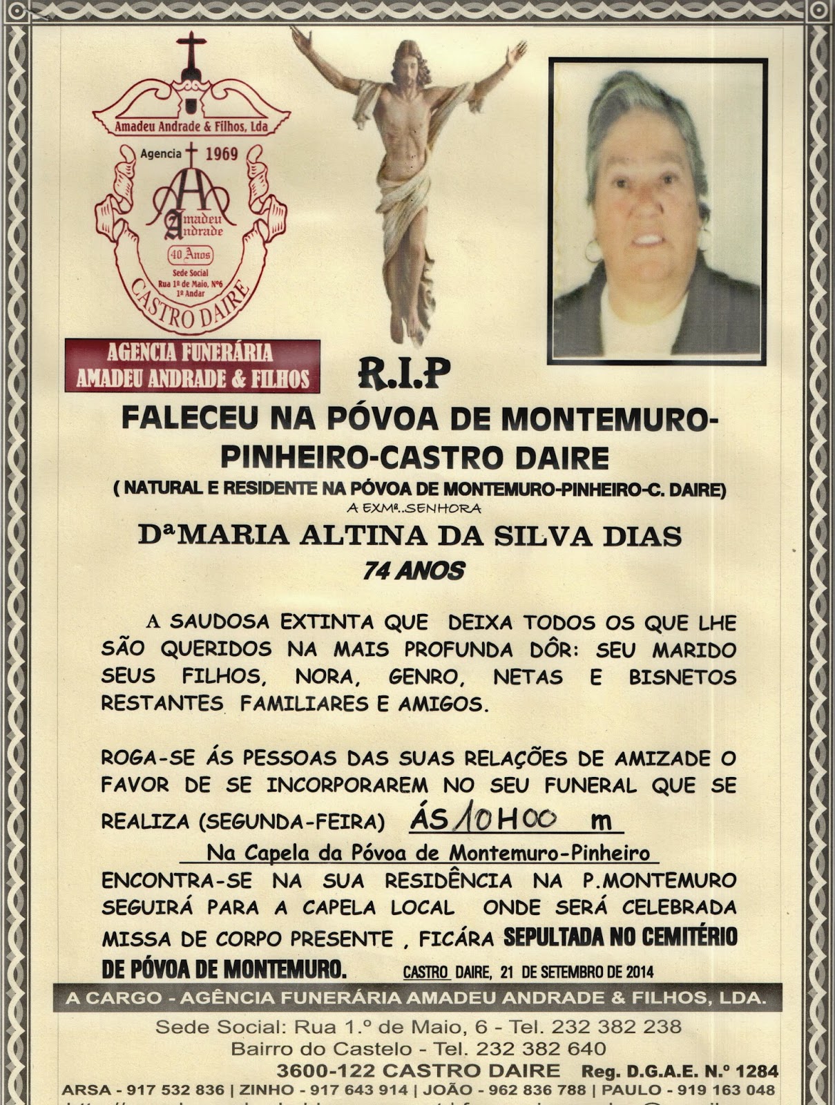 FALECIMENTO DA SRªDª MARIA ALTINA DA SILVA DIAS-74 ANOS (P.MONTEMURO)